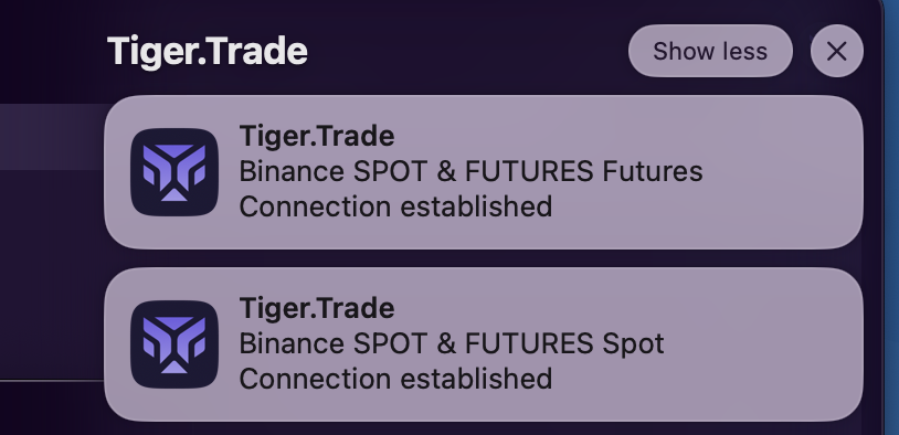 Hit **Connect to Binance**. Once the connection is established, you will see the notification: