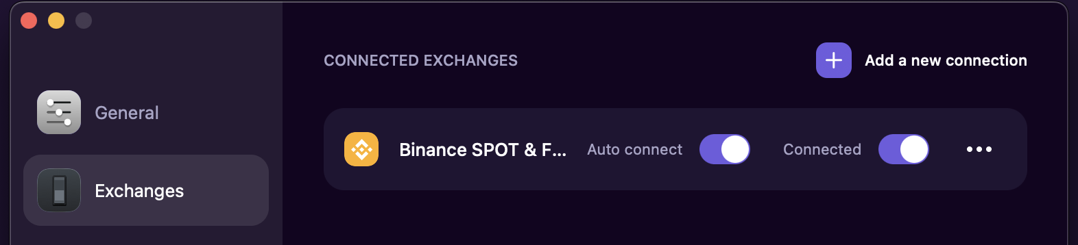 2. In the window that opens, click the **Add new exchange** button and select **Binance** from the list that appears. (for now, we only support Binance.com)